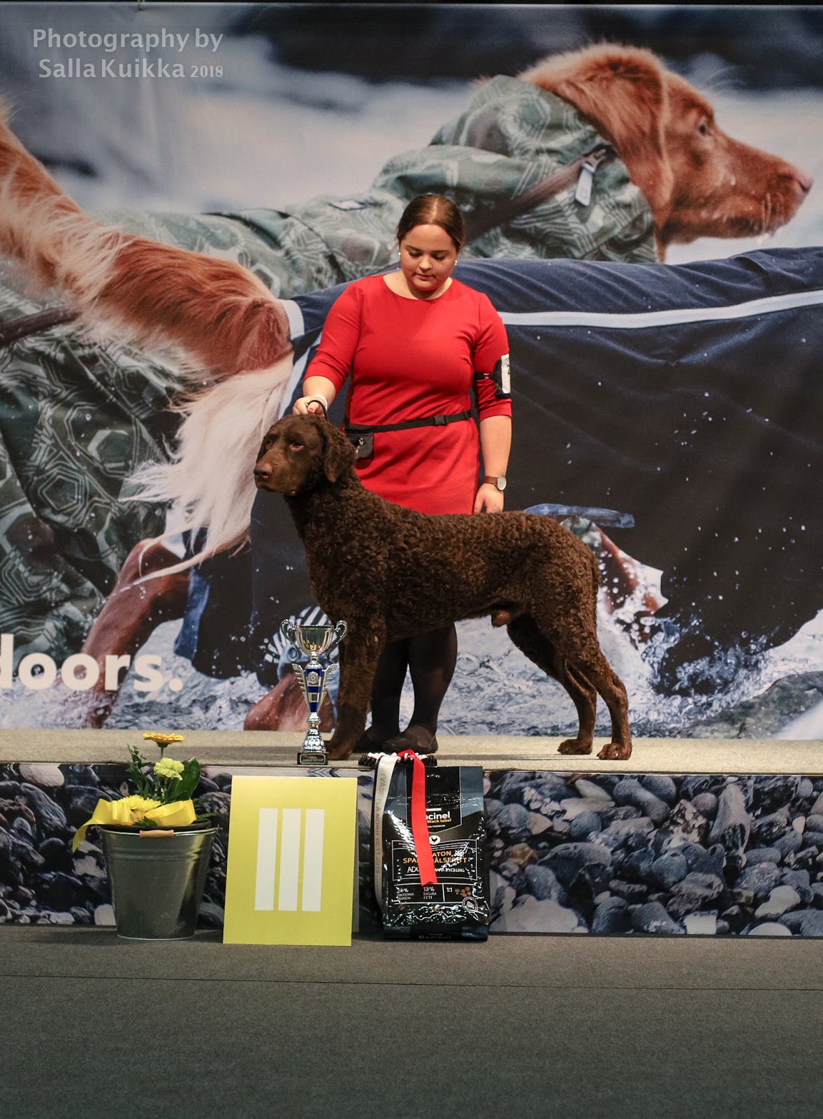 "Hyvät mittasuhteet. Tyypillinen pää. Hyvä ilme. Saksipurenta. Hyvät korvat. Kaunis kaula. Hyvä takaa. Hyvin kulmautunut takaa. Melko hyvä olkapää, hieman pehmeä välikämmen. Liikkuu takaa hieman ahtaasti, vakaasti edestä, hyvin sivulta. Turkki tyypillinen laatu, tiivis kihara."